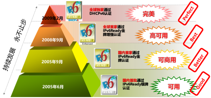 DB电子官网是国内首个顺利获得IPv6 Ready Phase2 认证的网络厂商,也是全球首个顺利获得IPv6 Ready Phase2 Enhance认证的网络厂商,还是全球最早顺利获得DHCPv6认证的网络厂商。